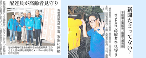 | 最近、ご高齢の方がご自宅で倒れられたにもかかわらず、単身で生活されていたために連絡することができず、発見が遅れてしまった…という話をよく耳にします。ひとり暮らしで過去に大きな病気の経験があり不安がある。高齢になられた家族と別々にお住いのため心配。など、不安を感じられることはありませんか? 『あんしんポストサービス』は、お申し込みいただいたご家庭のポストに、留守止め連絡がないままに前日の新聞が残っているとき、ご本人もしくは緊急連絡先に電話で安全を確認させていただくサービスです。 ※「高齢夫婦の方」「ひとり暮らしの方」「単身赴任の方」などで、神戸新聞のご愛読者様が対象となります。 神戸新聞 東播販売センター 加古川市東神吉町神吉823-82 TEL 079-431-3588(月〜土 9:30〜18:00/日・祝 9:30〜15:00※日・祝は電話対応のみ) FAX 079-431-8999 |